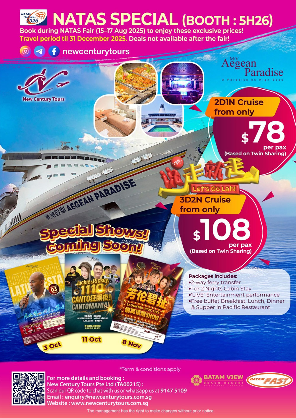 Soon Travel Pte Ltd acts as an authorized agent of New Century Tours Corporation (Private) Limited for the sale of Aegean Paradise Cruise tickets. This website serves as a booking platform and does not independently operate as a travel agency. All transactions, terms, and conditions adhere to the regulations set by New Century Tours Corporation (Private) Limited.