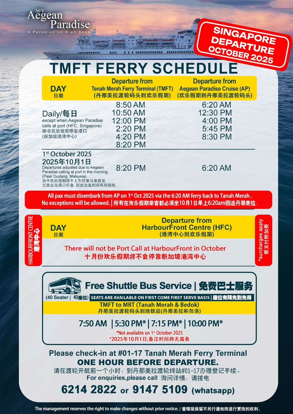 Special Notice: All passengers must disembark from AP at 6:20am via ferry back to Tanah Merah on 1st Oct 2025 (Wednesday).